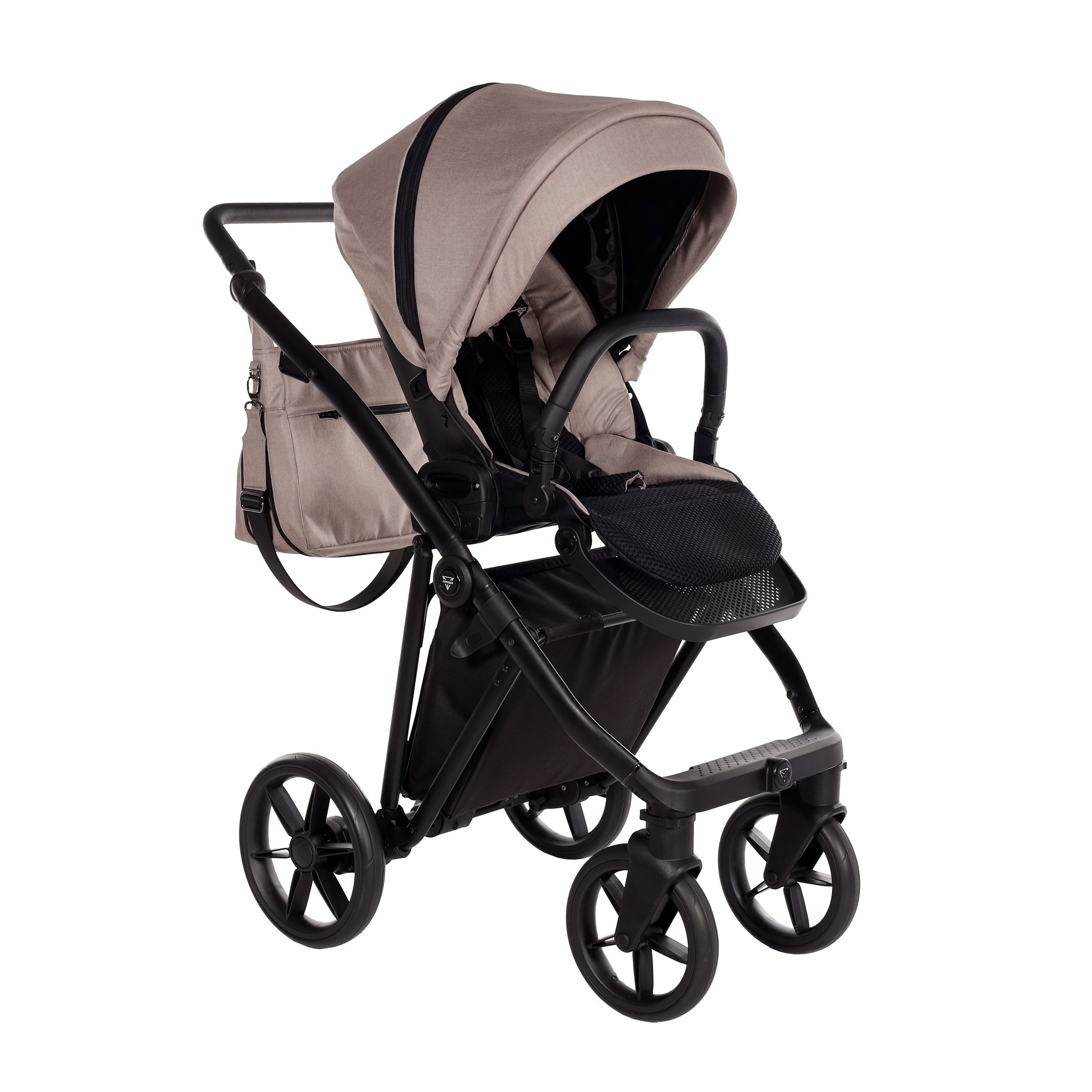 - ima 3- točkovni varnostni pas, zaščitno strehico in pokrivalo za noge,